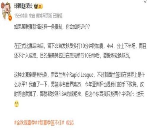 就在众多媒体人和球迷还在热议时间缩短的问题的时候,媒体人“球圈赵探长”又放出了猛料,表示“某联赛”正在酝酿增加一条赛制,那就是在正式比赛结束后,两队的非首发球员还要留下来打10分钟的4V4比赛,分为上下半场且不计入成绩。这样的做法,美其名曰是锻炼轮换球员。至于这个“某联赛”是哪个联赛,虽然“球圈赵探长”并没有明说,但球迷们都清楚,就是说的CBA联赛。随后有知情人透露,篮协方面正在商讨这一做法,只不过目前还没有最终确定。对于篮协的这个想法,“球圈赵探长”用两个字进行了评价:逆天!