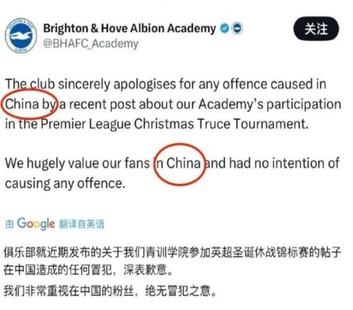 布莱顿将这张照片发到官方社媒,结果遭到中国球迷的猛烈批评,随后,俱乐部删除照片并道歉:“针对近期发布的帖子在中国造成的任何冒犯,俱乐部深表歉意。我们非常重视中国的球迷,我们绝无冒犯之意。”